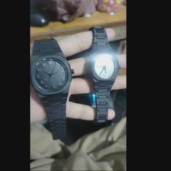 The Black Aura Couple Watch stands out with its striking monochrome design. Both the menβs and womenβs watches feature a matte black finish on the casing and integrated strap, creating a seamless, "aura" effect. The highlight of these Matching Timepieces is the sophisticated black dial adorned with elegant Arabic numerals, offering a distinctive cultural touch that merges tradition with contemporary urban fashion. This "stealth" look ensures the set remains versatile enough to complement any outfit, from business suits to casual streetwear.